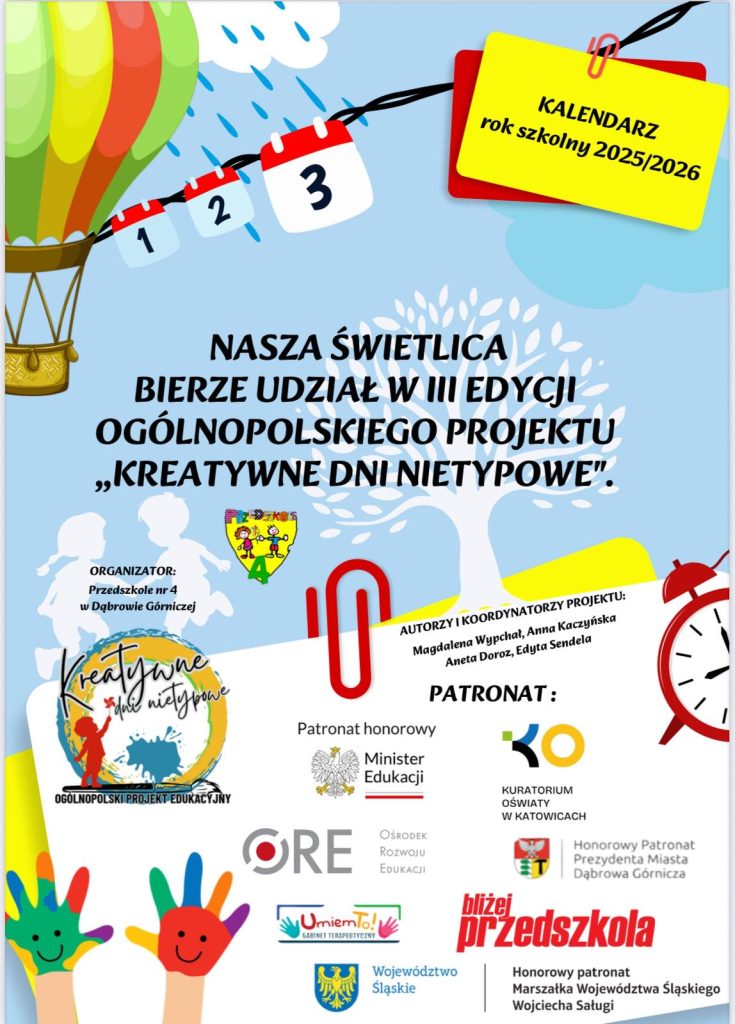 W tym roku szkolnym dzieci ze świetlicy klas 1 uczestniczą w IV edycji Międzynarodowego Projektu Edukacyjnego – „Kreatywne Prace Plastyczne”. Celem projektu jest wspieranie rozwoju kreatywności. W każdym miesiącu na dzieci będzie czekało nowe zadanie rozwijające wyobraźnię i zachęcające do wyrażania ekspresji. Zajęcia prowadzone są przez: p. Maję Rucińską i p. Małgorzatę Pituła.